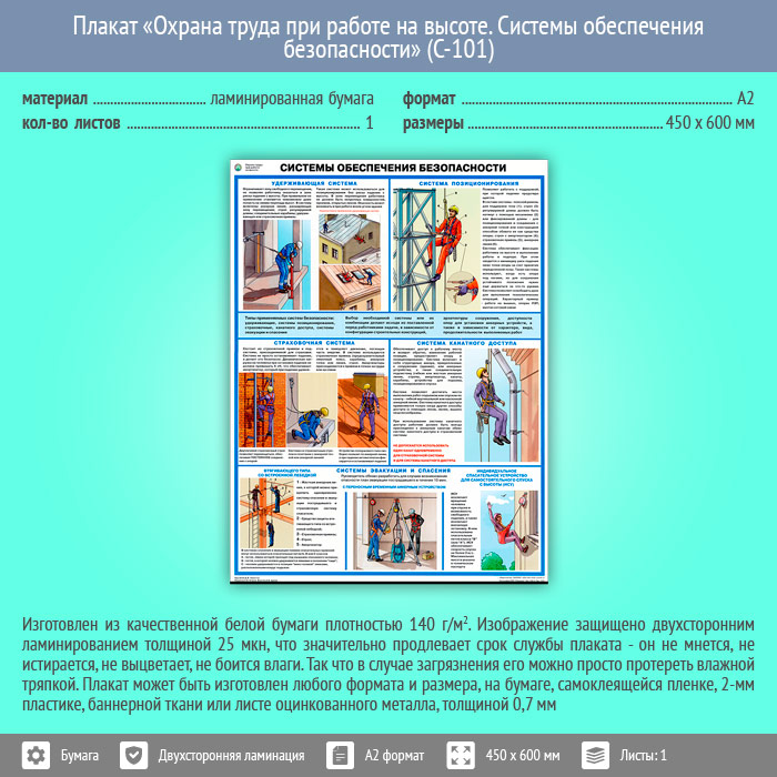 Плакат «Охрана труда при работе на высоте. Системы обеспечения безопасности» (С-101, ламинированная бумага, А2, 1 лист) в Краснодаре купить