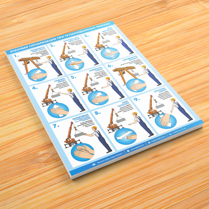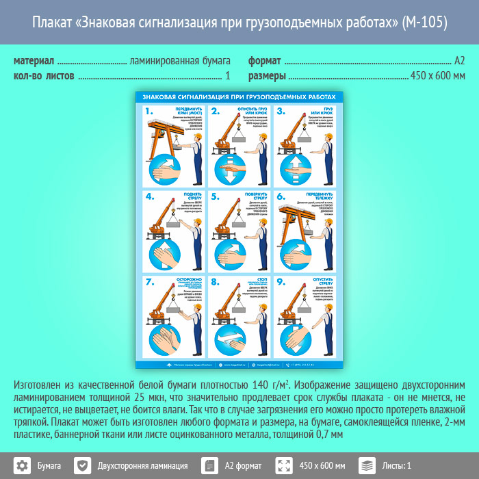Плакат «Знаковая сигнализация при грузоподъемных работах» (М-105, ламинированная бумага, А2, 1 лист) в Краснодаре купить