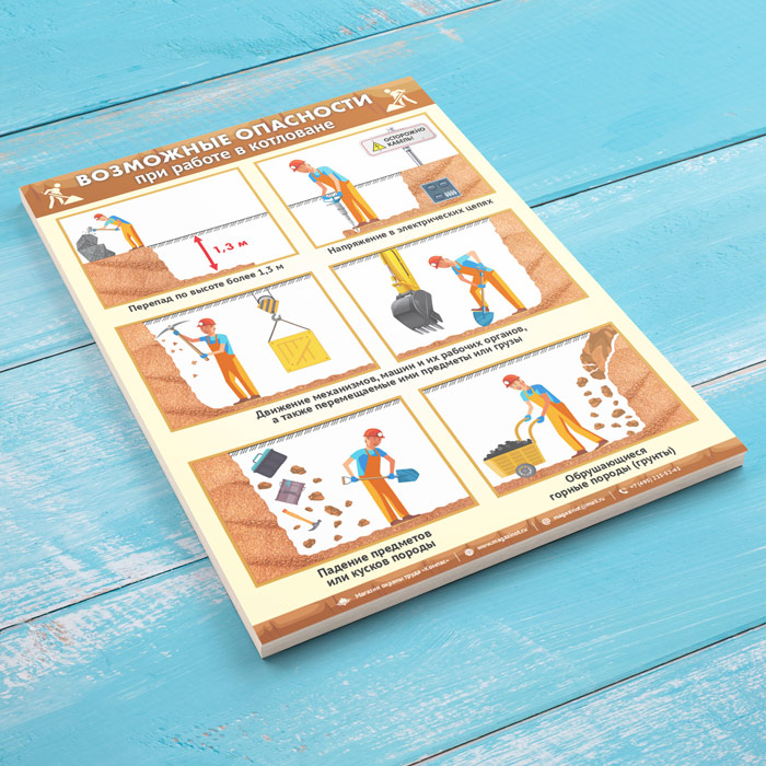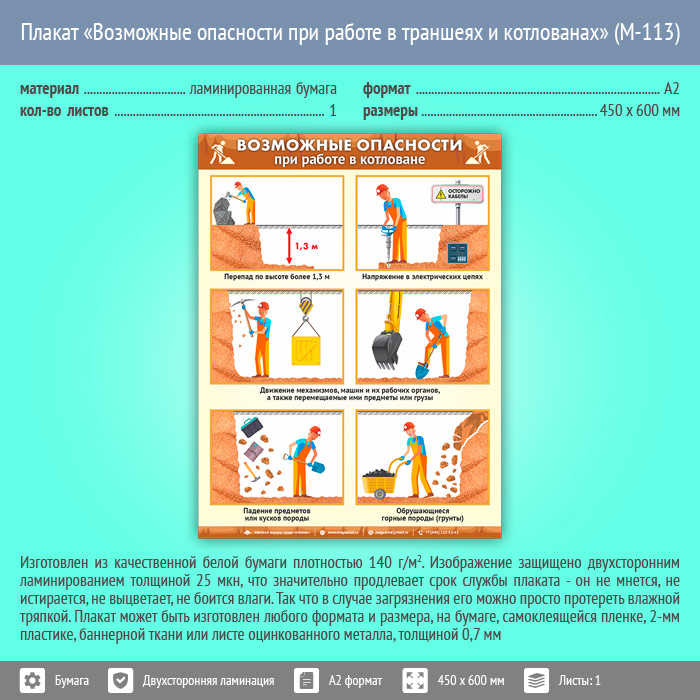 Плакат «Возможные опасности при работе в траншеях и котлованах» (М-113, ламинированная бумага, А2, 1 лист) в Краснодаре купить