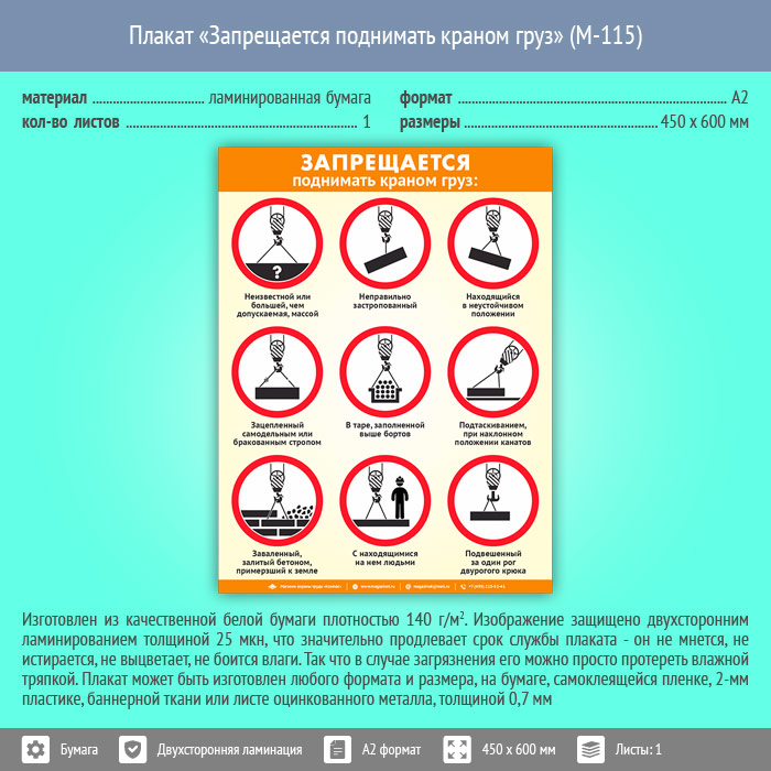 Плакат «Запрещается поднимать краном груз» (М-115, ламинированная бумага, А2, 1 лист) в Краснодаре купить