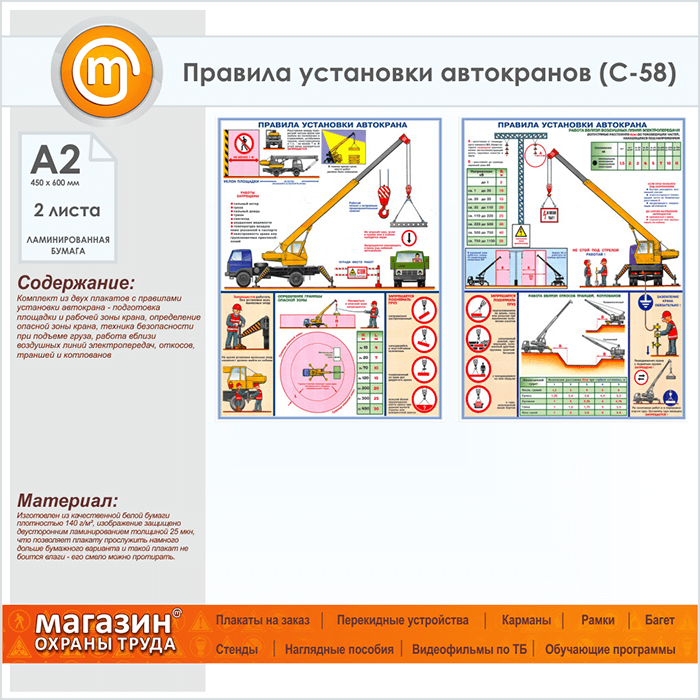Плакаты «Правила установки автокранов» (С-58, ламинированная бумага, А2, 2 листа) в Краснодаре купить