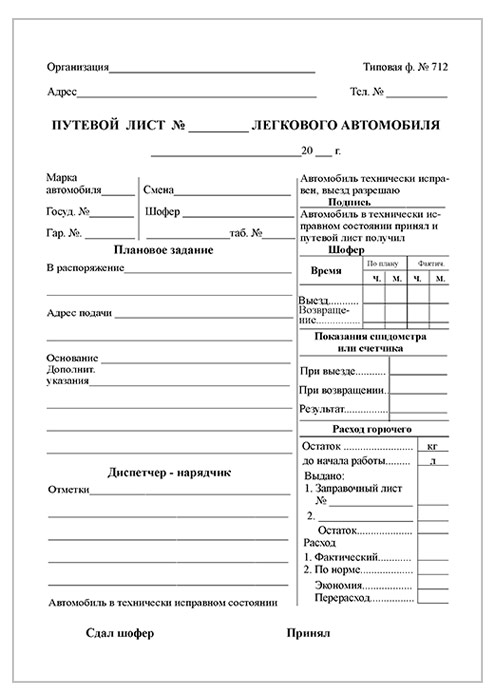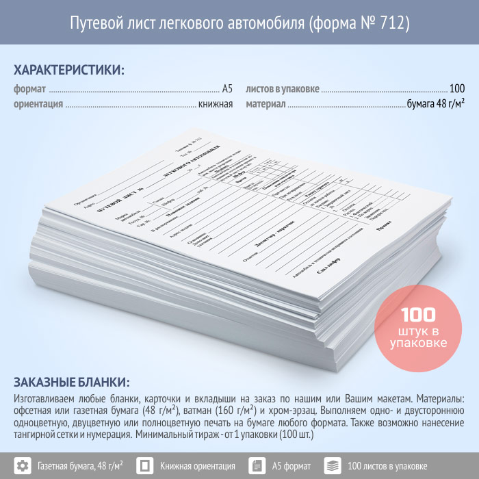 Путевой лист легкового автомобиля (форма № 712, упаковка из 100 штук) в Краснодаре купить