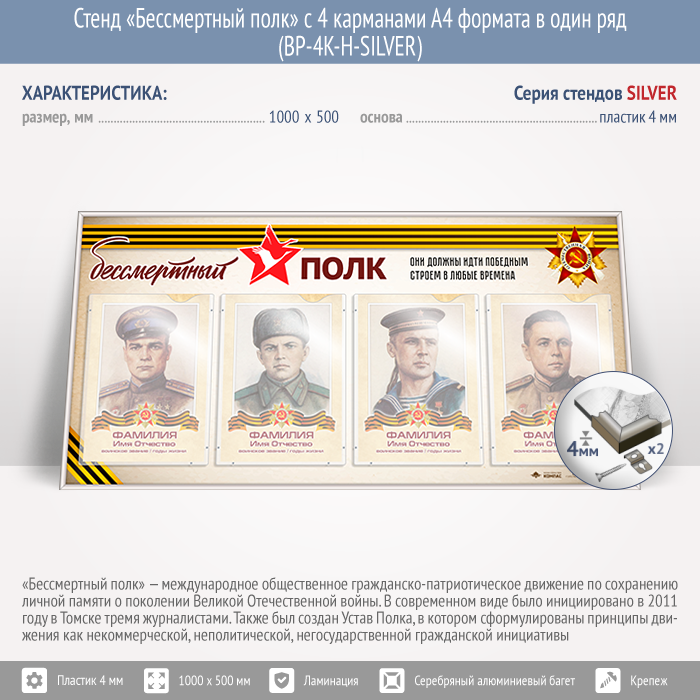 Стенд «Бессмертный полк» с 4 карманами А4 формата в один ряд (BP-4K-H-SILVER) в Краснодаре купить