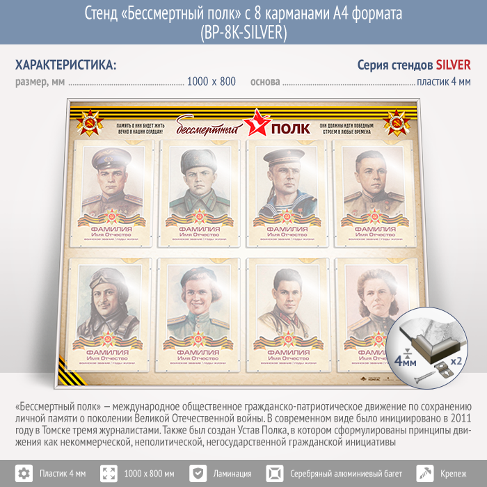 Стенд «Бессмертный полк» с 8 карманами А4 формата (BP-8K-SILVER) в Краснодаре купить