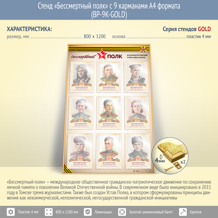 Стенд «Бессмертный полк» с 9 карманами А4 формата (BP-9K-GOLD) в Краснодаре купить