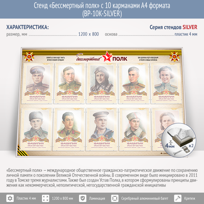 Стенд «Бессмертный полк» с 10 карманами А4 формата (BP-10K-SILVER) в Краснодаре купить