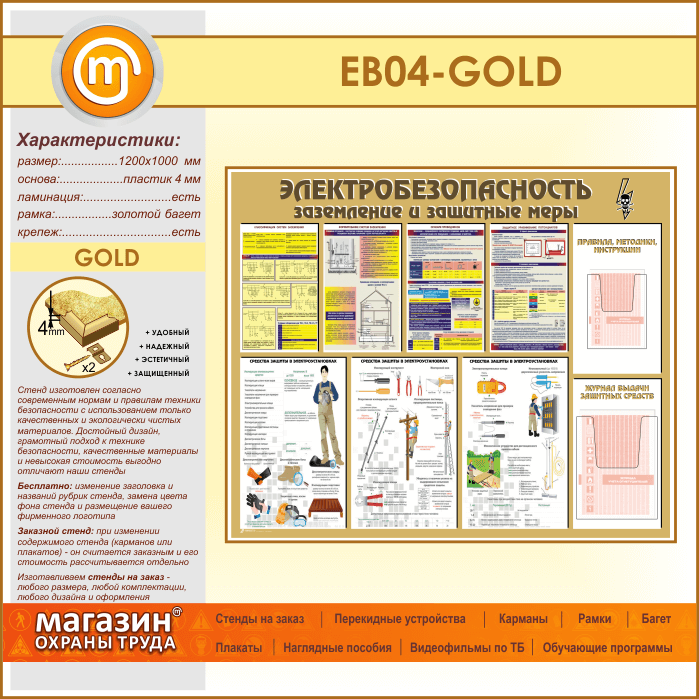 Стенд «Электробезопасность. Заземление и защитные меры» с 2 объемными карманами (EB-04-GOLD) в Краснодаре купить