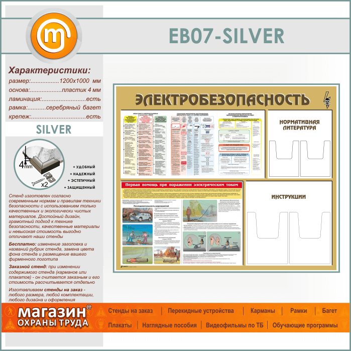 Стенд «Электробезопасность» с 4 объемными карманами (EB-07-SILVER) в Краснодаре купить