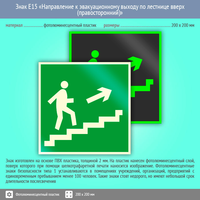 Знак E15 «Направление к эвакуационному выходу по лестнице вверх (правосторонний)» (фотолюминесцентный пластик, 200х200 мм) в Краснодаре купить