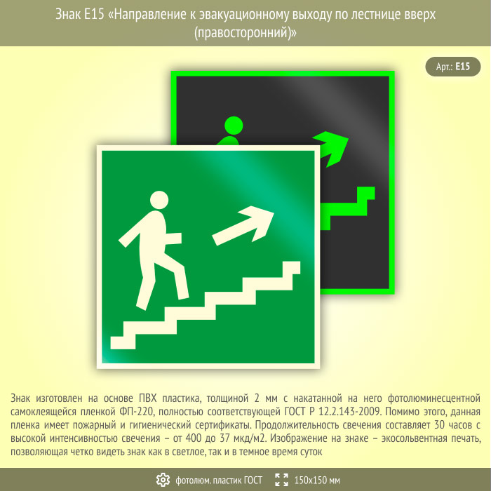 Знак E15 «Направление к эвакуационному выходу по лестнице вверх (правосторонний)» (фотолюминесцентный пластик ГОСТ 34428-2018, 150х150 мм) в Краснодаре купить