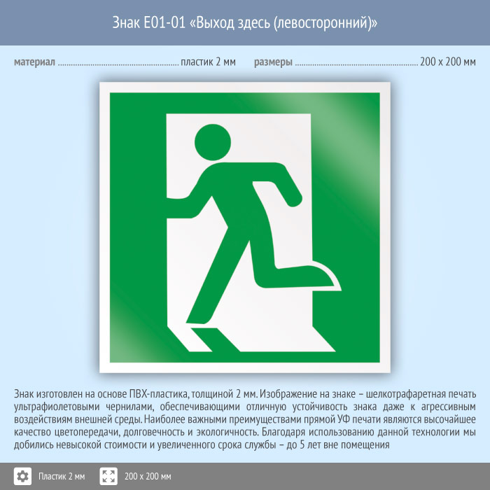 Знак E01-01 «Выход здесь (левосторонний)» (пластик, 200х200 мм) в Краснодаре купить