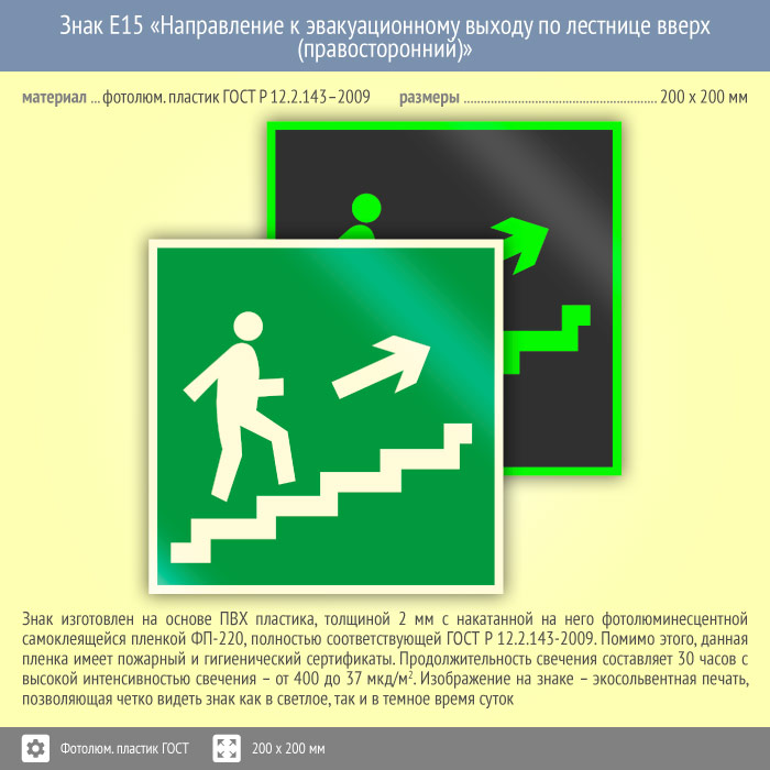 Знак E15 «Направление к эвакуационному выходу по лестнице вверх (правосторонний)» (фотолюминесцентный пластик ГОСТ 34428-2018, 200х200 мм) в Краснодаре купить