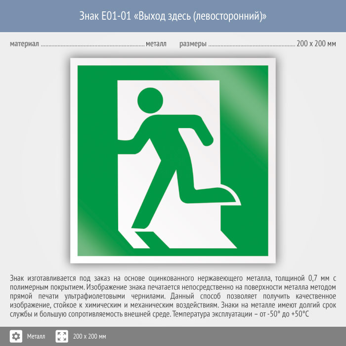 Знак E01-01 «Выход здесь (левосторонний)» (металл, 200х200 мм) в Краснодаре купить