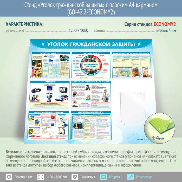 Стенд «Уголок гражданской защиты» с плоским А4 карманом (GO-42.2-ECONOMY2) в Краснодаре купить