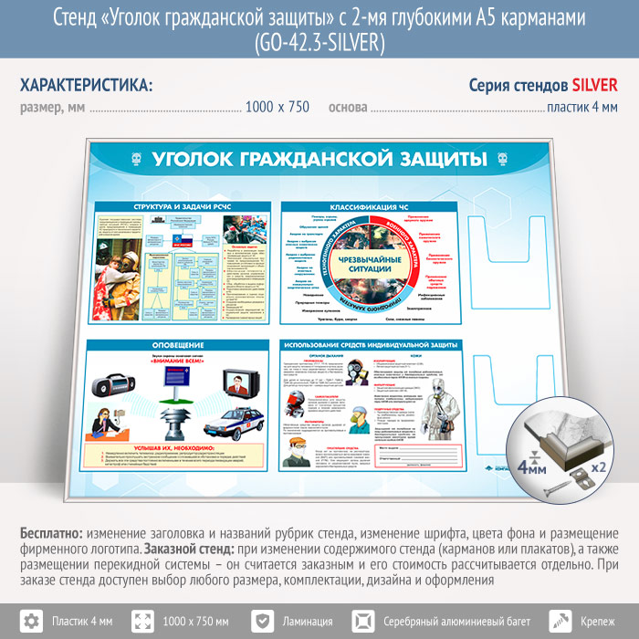 Стенд «Уголок гражданской защиты» с 2-мя глубокими А5 карманами (GO-42.3-SILVER) в Краснодаре купить