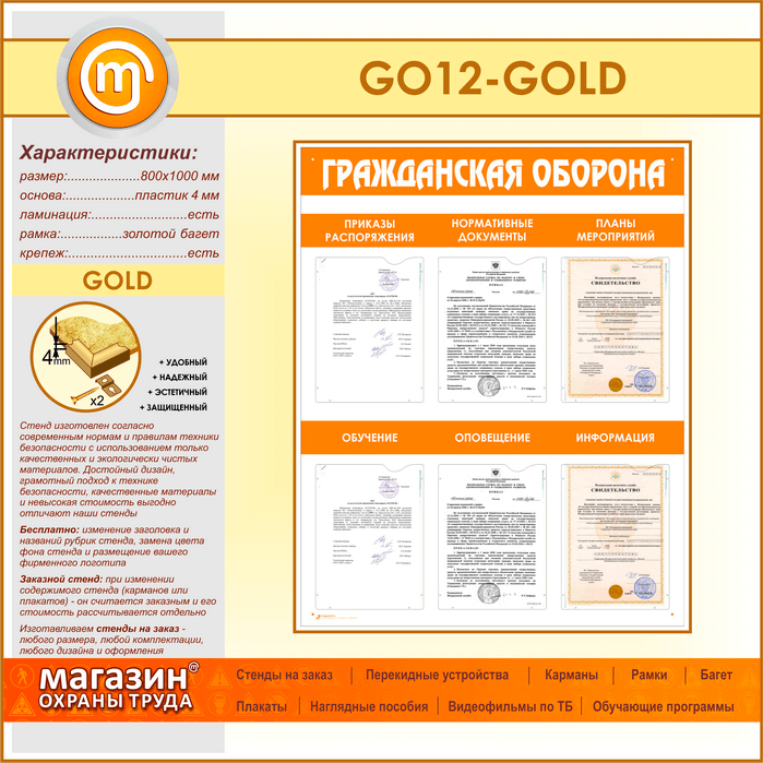 Стенд «Гражданская оборона» с 6 плоскими карманами (GO-12-GOLD) в Краснодаре купить