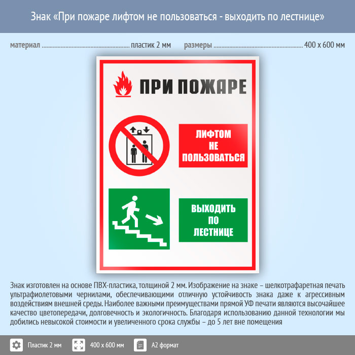 Знак «При пожаре лифтом не пользоваться - выходить по лестнице», КЗ-73 (пластик, 400х600 мм) в Краснодаре купить