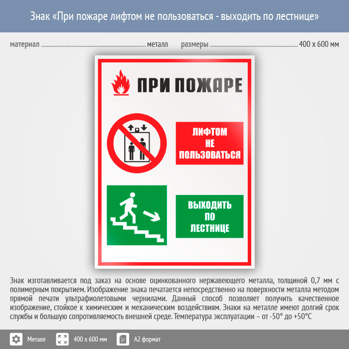 Знак «При пожаре лифтом не пользоваться - выходить по лестнице», КЗ-73 (металл, 400х600 мм) в Краснодаре купить