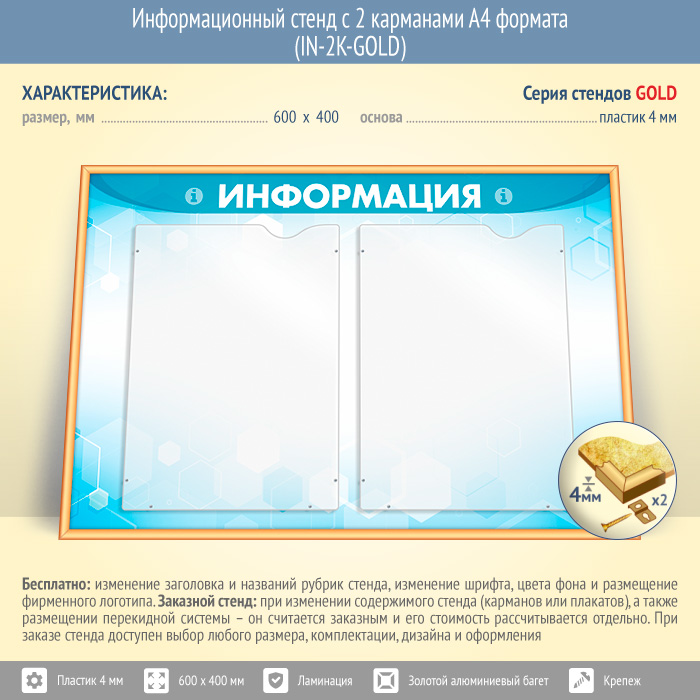 Информационный стенд с 2 карманами А4 формата (IN-2K-GOLD) в Краснодаре купить