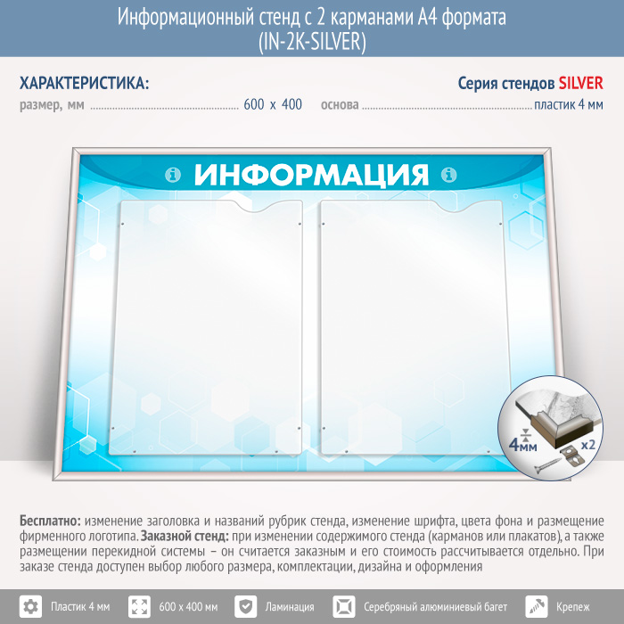 Информационный стенд с 2 карманами А4 формата (IN-2K-SILVER) в Краснодаре купить