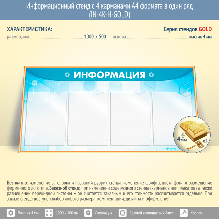 Информационный стенд с 4 карманами А4 формата в один ряд (IN-4K-H-GOLD) в Краснодаре купить