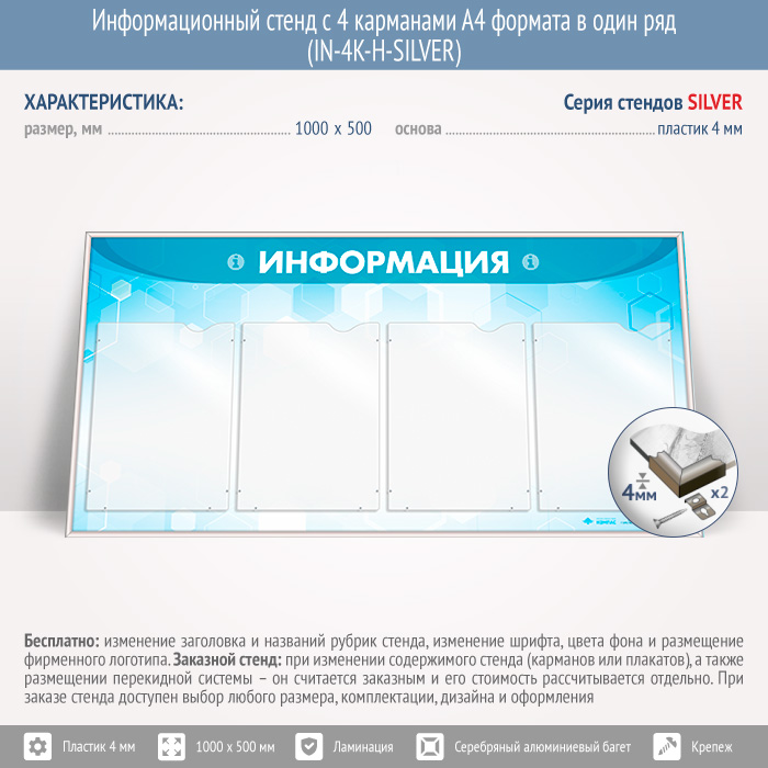 Информационный стенд с 4 карманами А4 формата в один ряд (IN-4K-H-SILVER) в Краснодаре купить
