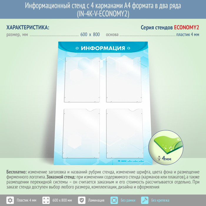 Информационный стенд с 4 карманами А4 формата в два ряда (IN-4K-V-ECONOMY2) в Краснодаре купить