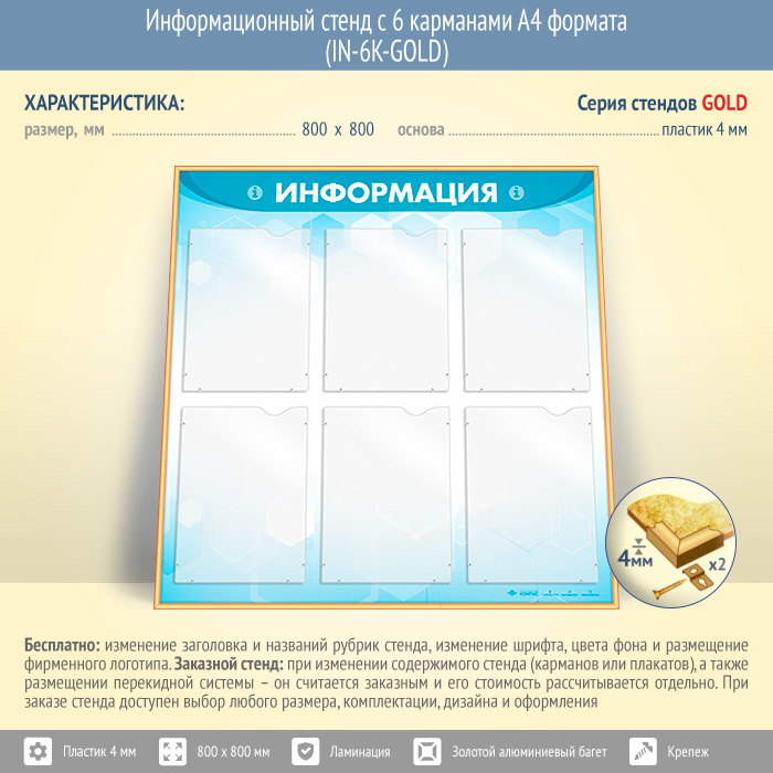 Информационный стенд с 6 карманами А4 формата (IN-6K-GOLD) в Краснодаре купить