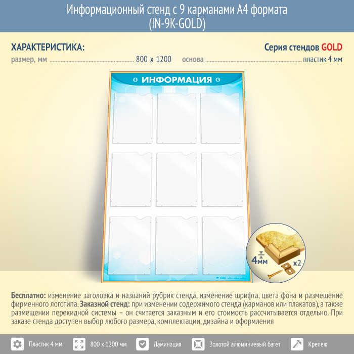 Информационный стенд с 9 карманами А4 формата (IN-9K-GOLD) в Краснодаре купить