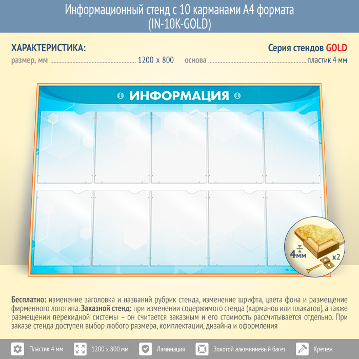 Информационный стенд с 10 карманами А4 формата (IN-10K-GOLD) в Краснодаре купить