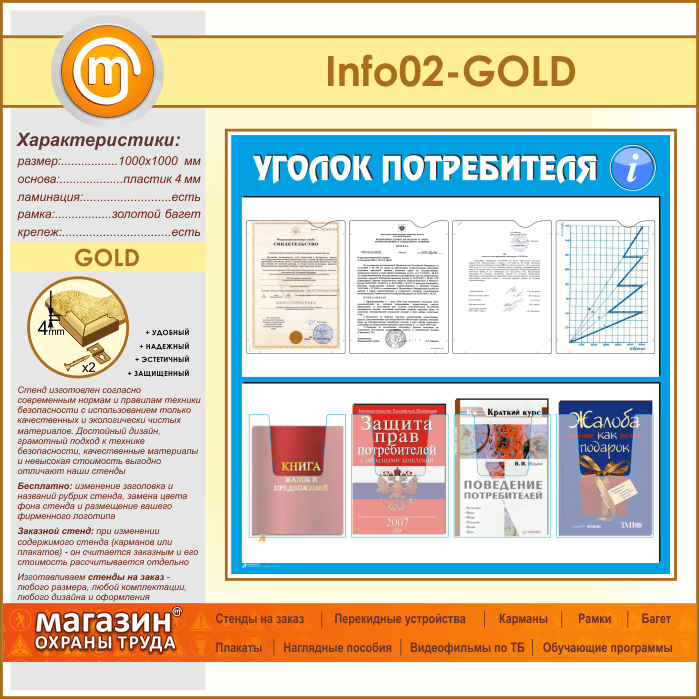 Стенд «Уголок потребителя» с 4 плоскими и 4 объемными карманами А4 формата (IN-02-GOLD) в Краснодаре купить