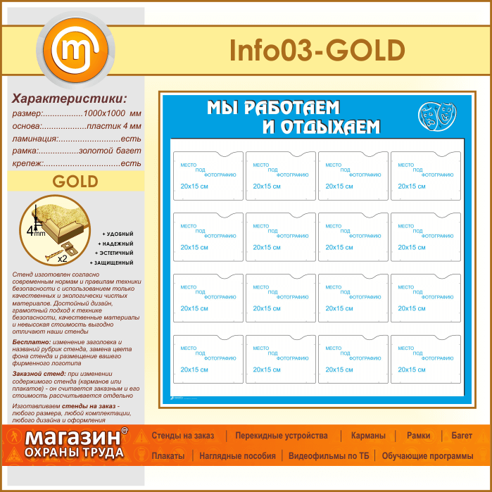 Стенд «Мы работаем и отдыхаем» с 16 карманами А5 формата (IN-03-GOLD) в Краснодаре купить
