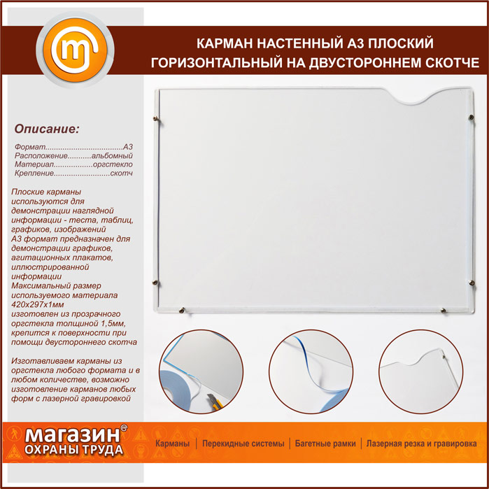 Карман настенный А3 плоский горизонтальный на двустороннем скотче в Краснодаре купить