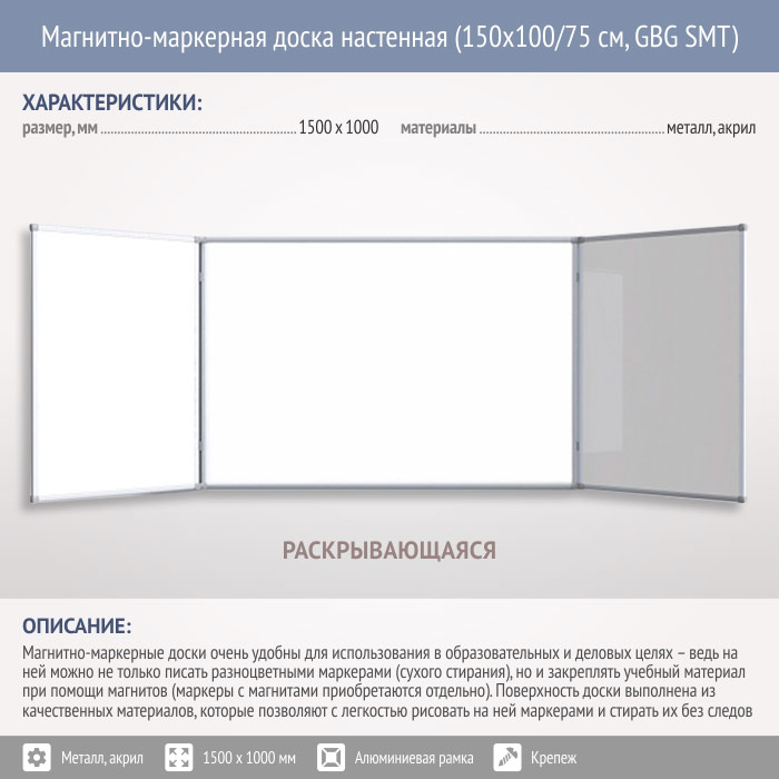 Магнитно-маркерная доска настенная (150x100/75 см, GBG SMT) в Краснодаре купить