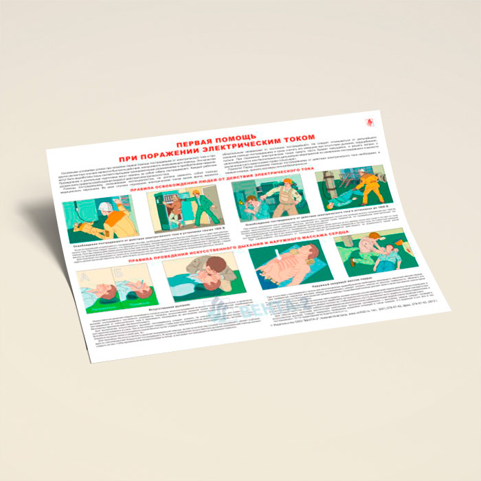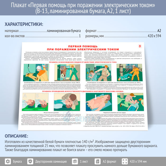 Плакат «Первая помощь при поражении электрическим током» (В-13, ламинированная бумага, А2, 1 лист) в Краснодаре купить