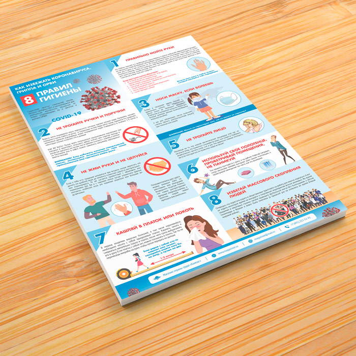 Плакат «Восемь правил гигиены. Как избежать коронавируса, гриппа и ОРВИ» (М-28, ламинированная бумага, А3, 1 лист) в Краснодаре купить