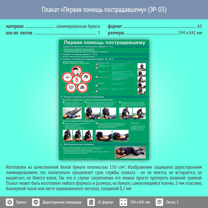 Плакат «Первая помощь пострадавшему» (ЭР-03, ламинированная бумага, А1, 1 лист) в Краснодаре купить