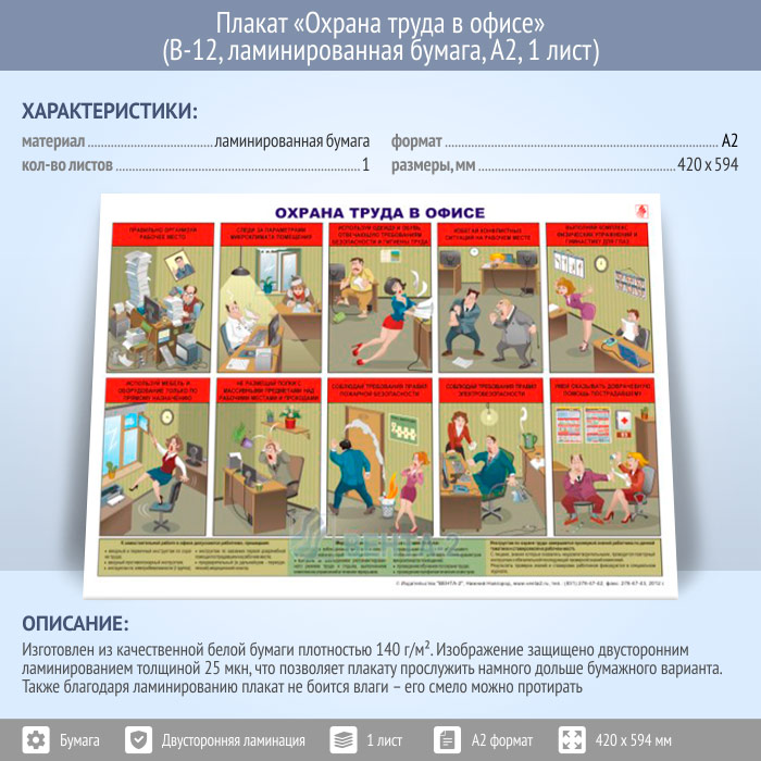Плакат «Охрана труда в офисе» (В-12, ламинированная бумага, А2, 1 лист) в Краснодаре купить
