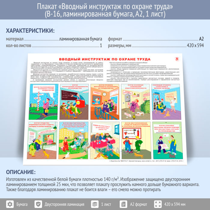 Плакат «Вводный инструктаж по охране труда» (В-16, ламинированная бумага, А2, 1 лист) в Краснодаре купить