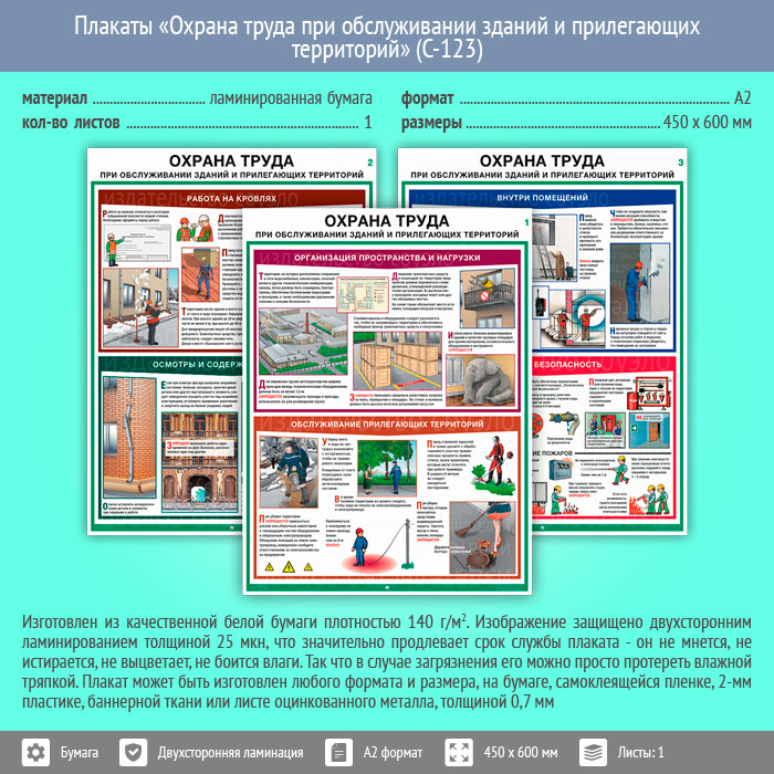 Плакаты «Охрана труда при обслуживании зданий и прилегающих территорий» (С-123, ламинированная бумага, А2, 3 листа) в Краснодаре купить