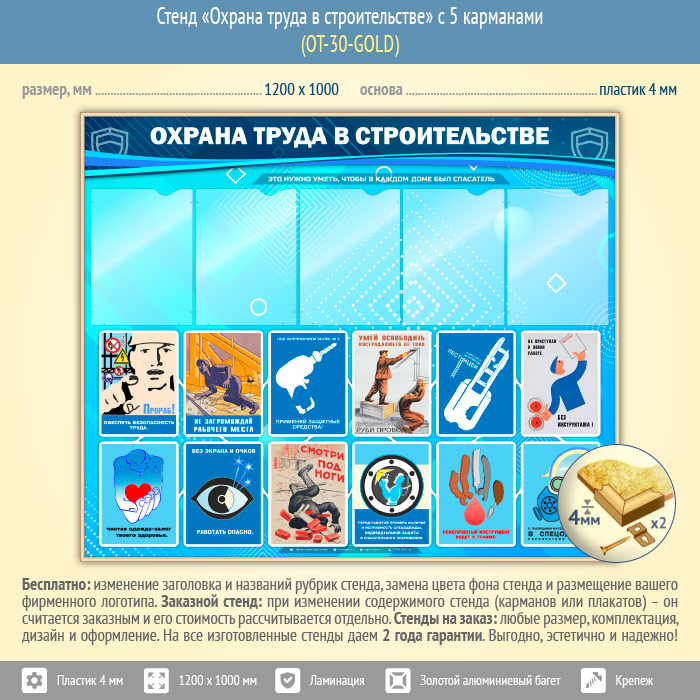 Стенд «Охрана труда в строительстве» с 5 карманами (OT-30-GOLD) в Краснодаре купить