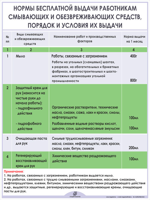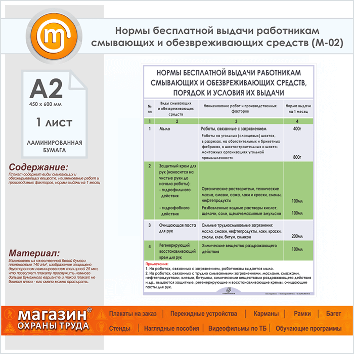 Плакат «Нормы бесплатной выдачи работникам смывающих и обезвреживающих средств» (М-02, ламинированная бумага, А2, 1 лист) в Краснодаре купить