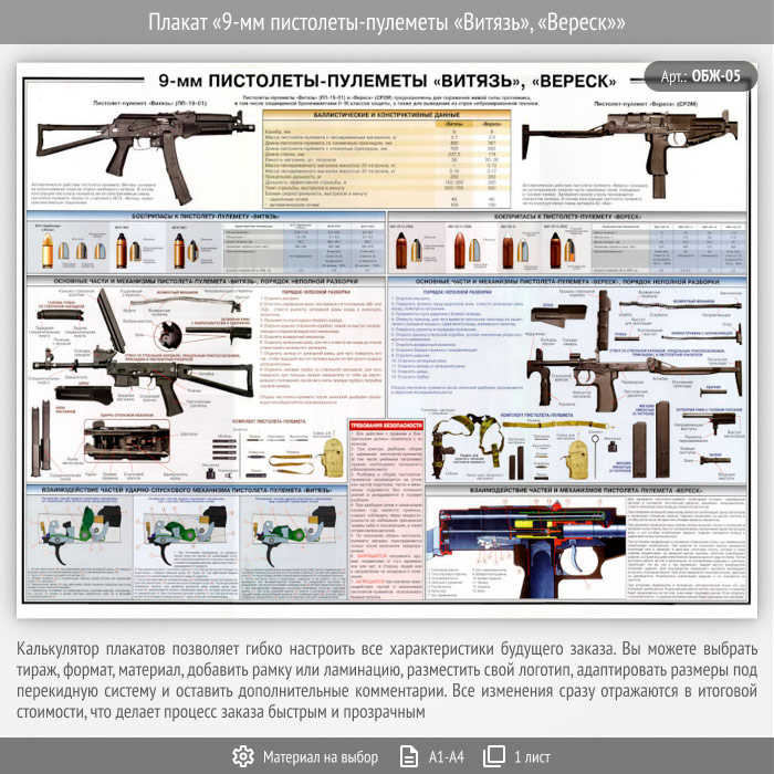 Плакат «9-мм пистолеты-пулеметы «Витязь», «Вереск»» (ОБЖ-05, 1 лист) в Краснодаре купить