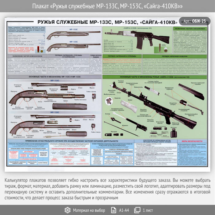 Плакат «Ружья служебные МР-133С, МР-153С, «Сайга-410КВ»» (ОБЖ-25, 1 лист) в Краснодаре купить