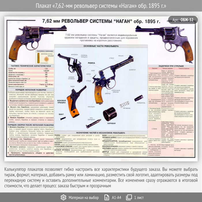 Плакат «7,62-мм револьвер системы «Наган» обр. 1895 г.» (ОБЖ-32, 1 лист) в Краснодаре купить