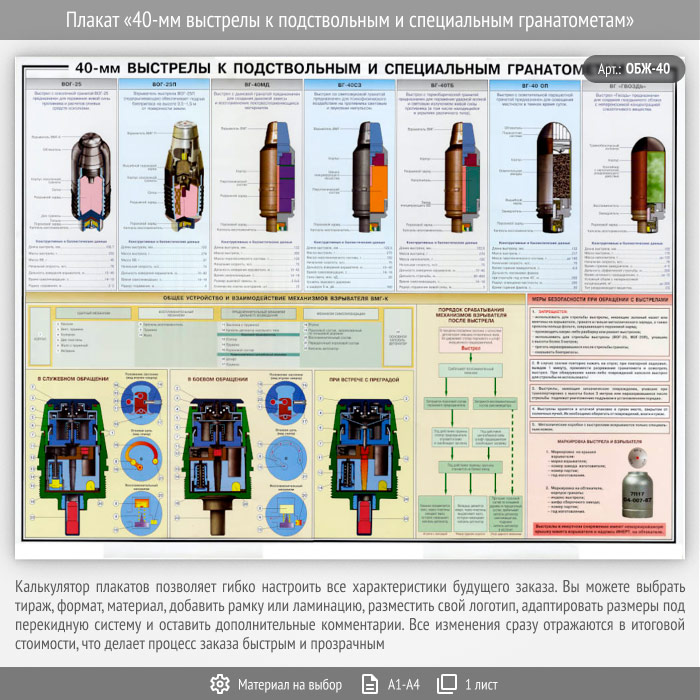 Плакат «40-мм выстрелы к подствольным и специальным гранатометам» (ОБЖ-40, 1 лист) в Краснодаре купить