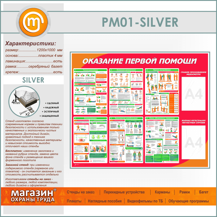 Стенд «Оказание первой помощи» с плоским и объемным карманами (PM-01-SILVER) в Краснодаре купить