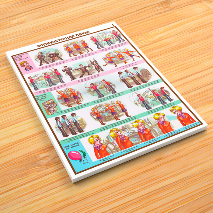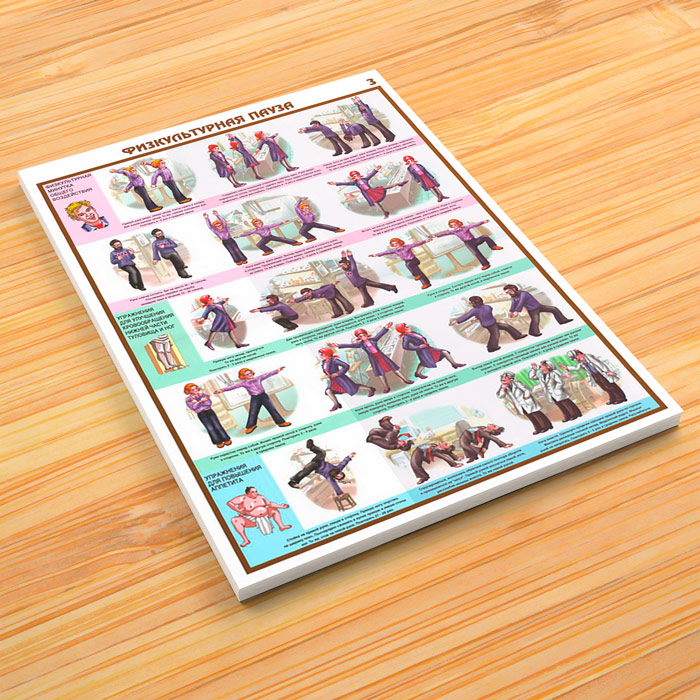 Комплект плакатов «Физкультурная пауза» из 3 листов, наглядно демонстрирующих упражнения для поддержания общей физической формы – физкультурная минутка общего воздействия, упражнения для снятия утомления с плеч, дыхательные упражнения, упражнения для улучшения мозгового кровообращения, упражнения для снятия стресса, упражнения для улучшения кровообращения нижней части туловища и ног, упражнения для повышения аппетита