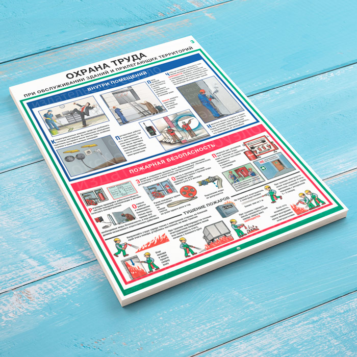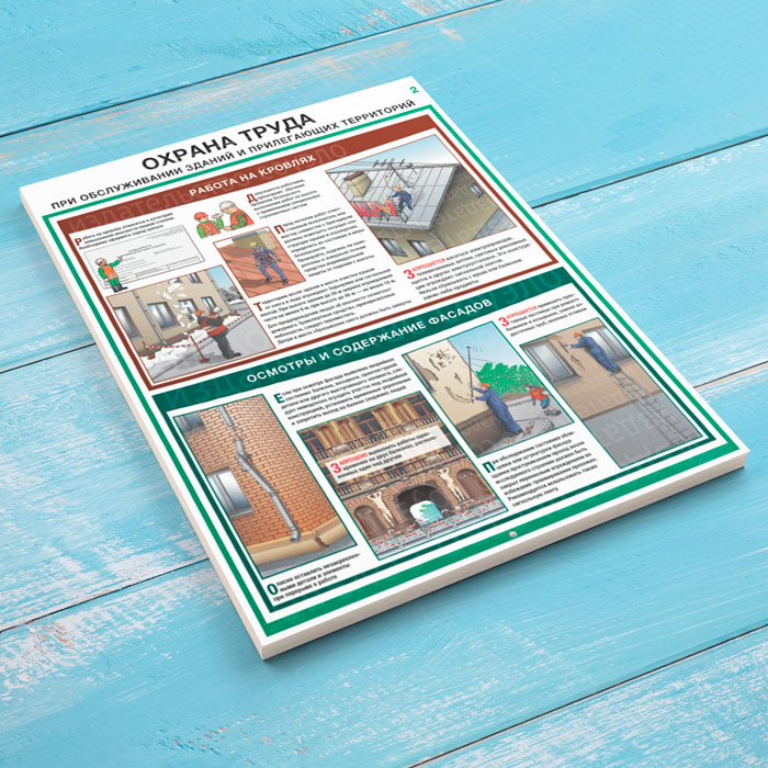Комплект плакатов «Охрана труда при обслуживании зданий и прилегающих территорий» из 3 листов содержит информацию о безопасных способах ведения работ при обслуживании зданий и прилегающих территорий: организация пространства, нагрузки, работы на территории, ремонт и обслуживание кровли, работы снаружи зданий и внутри помещений, пожарная безопасность. Полезен для повышения профессинального мастерства работников, а также в качестве дополнительного пособия при проведении инструктажей по охране труда