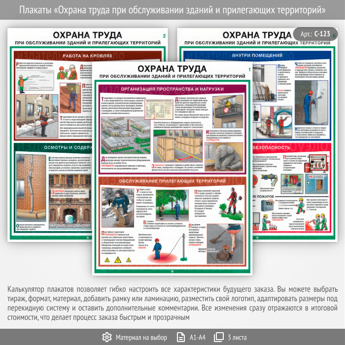 Плакаты «Охрана труда при обслуживании зданий и прилегающих территорий» (С-123, 3 листа)